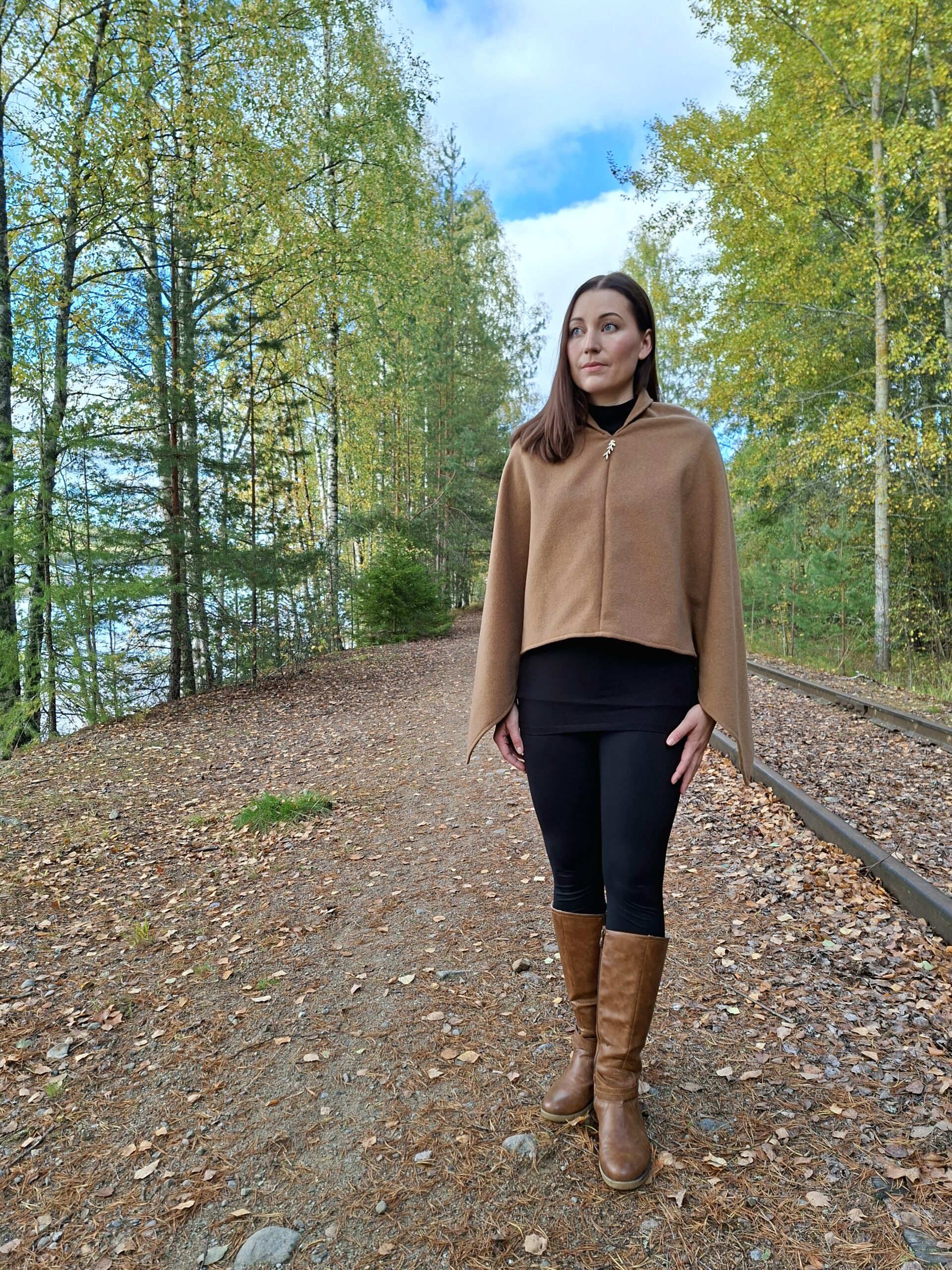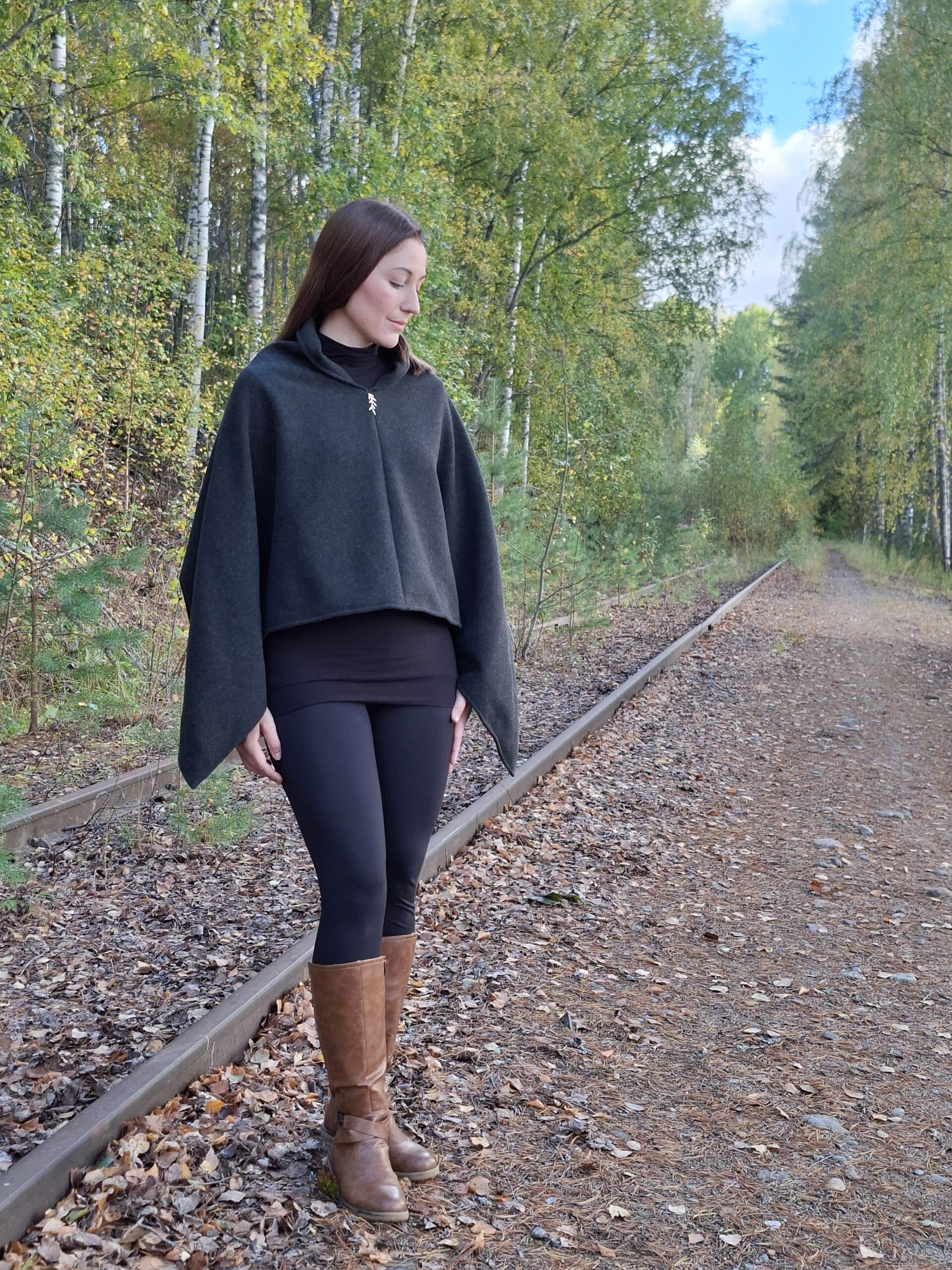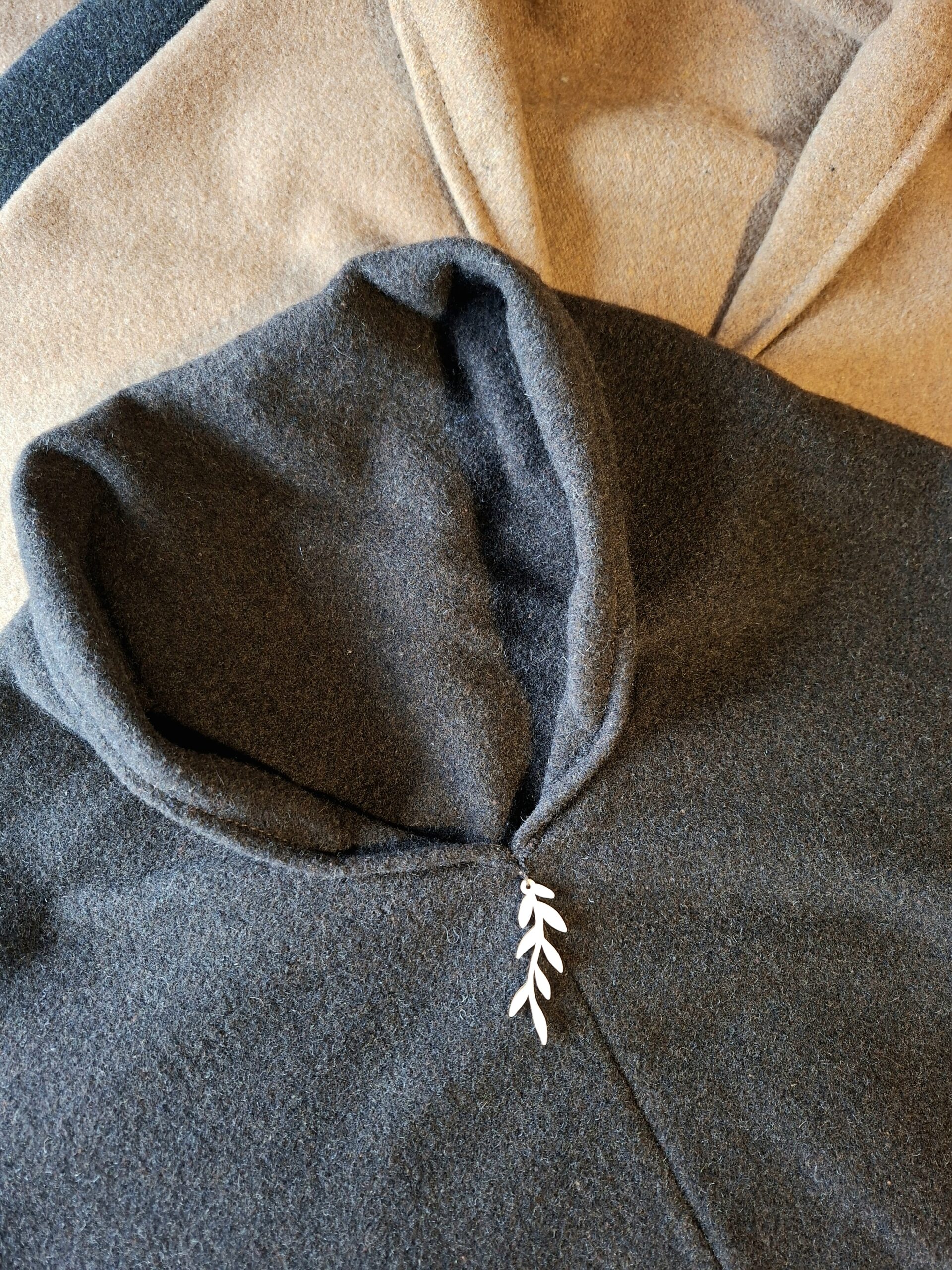 Ponchon pienet jujut; hihansuiden kiinnikkeet, jolloin helmaosuus ei ole niin liehuvainen -> lämmittävyys sekä kaulusmainen niskaosuus -> lämmittävyys, tekevät tästä mallista hieman erilaisen. Suomalaisesta koivuvanerista valmistettu LuonnostaLuotu lehdykkä-detalji viimeistelee ponchon ilmeen.