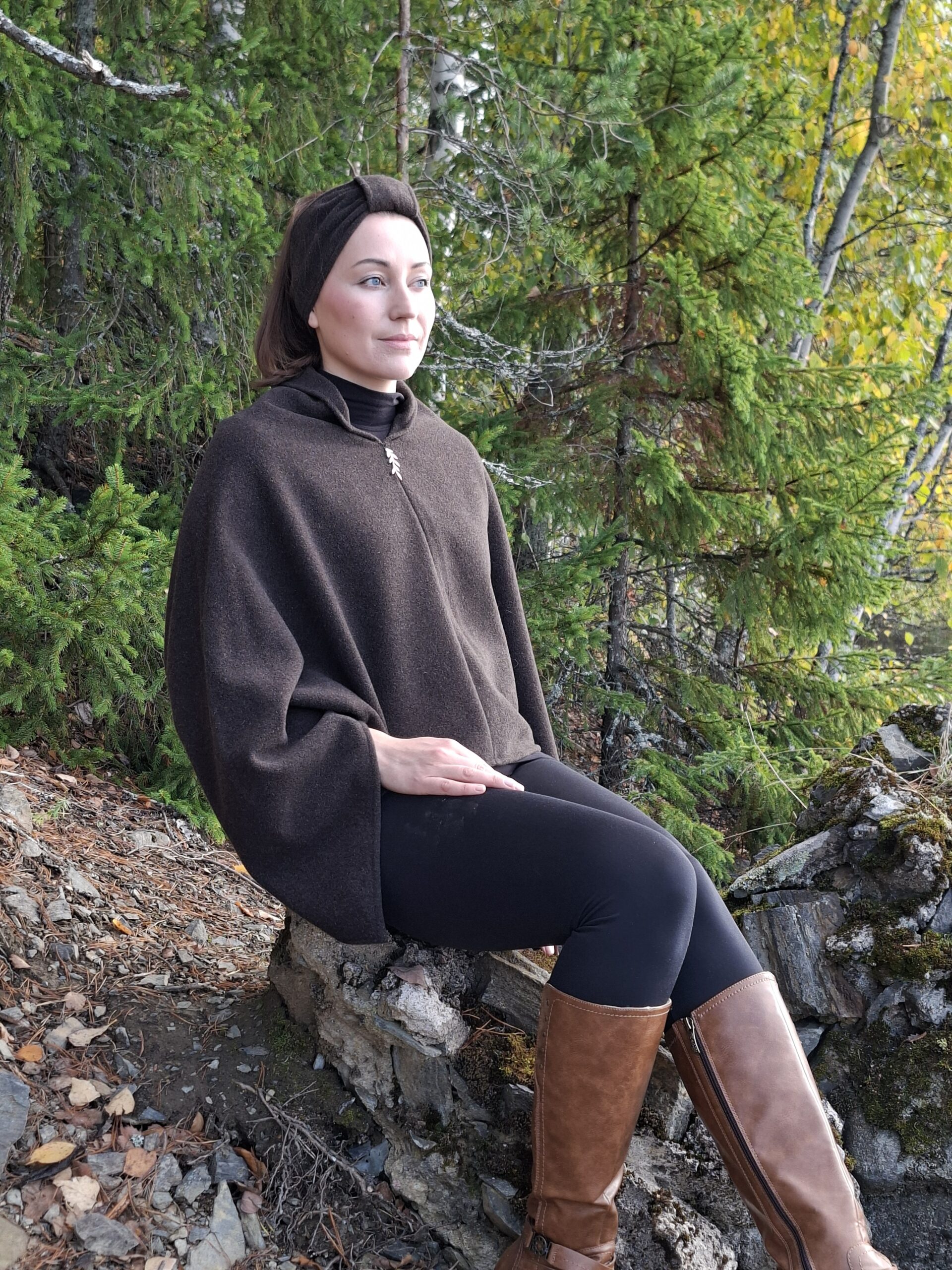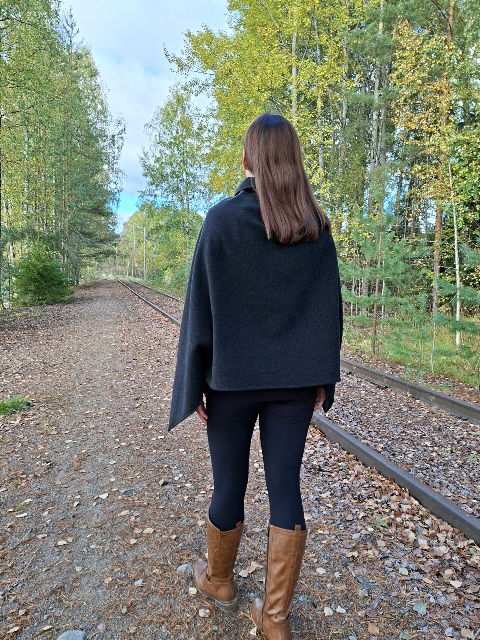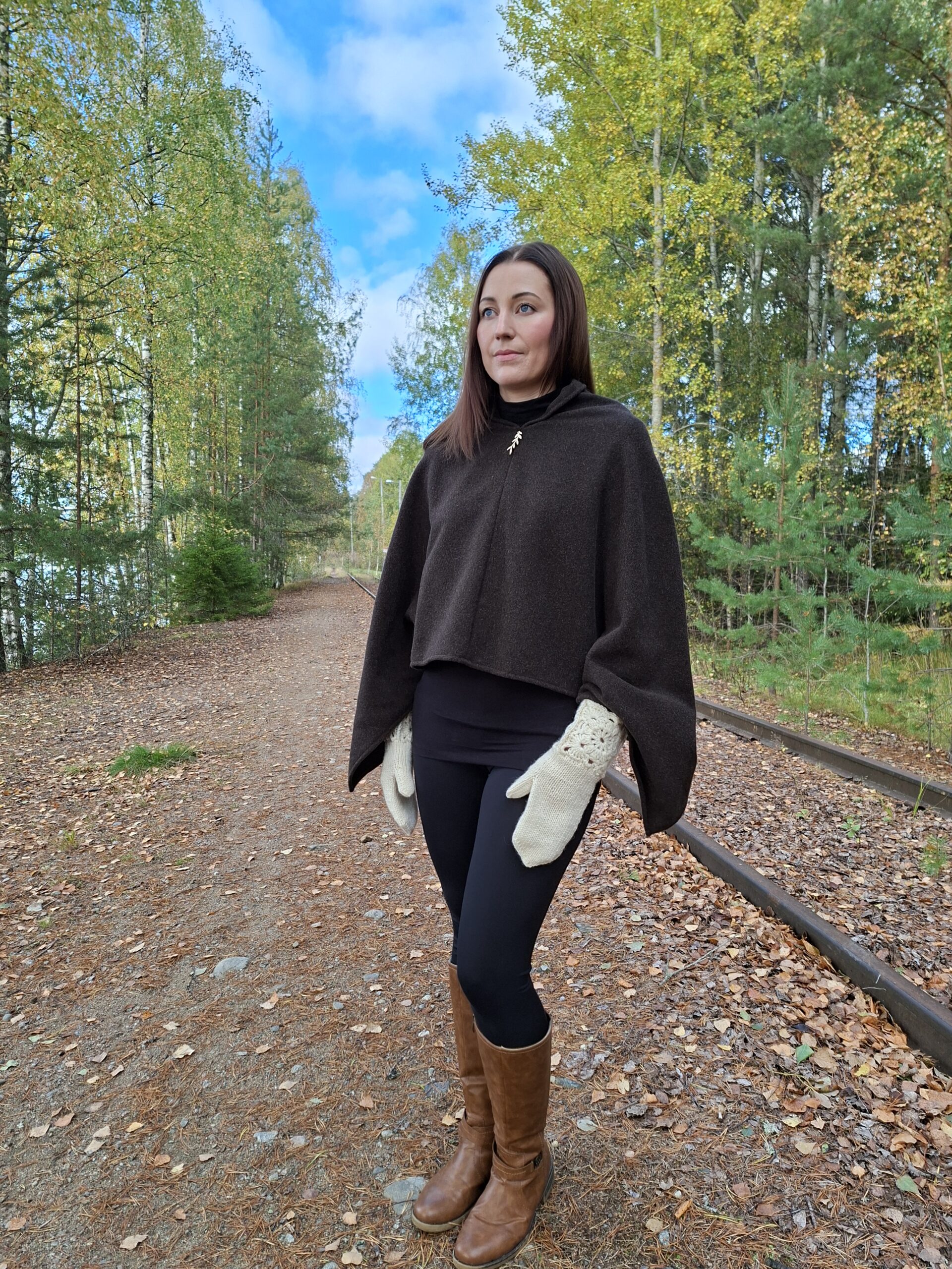 Ponchon pienet jujut; hihansuiden kiinnikkeet, jolloin helmaosuus ei ole niin liehuvainen -> lämmittävyys sekä kaulusmainen niskaosuus -> lämmittävyys, tekevät tästä mallista hieman erilaisen. Suomalaisesta koivuvanerista valmistettu LuonnostaLuotu lehdykkä-detalji viimeistelee ponchon ilmeen.